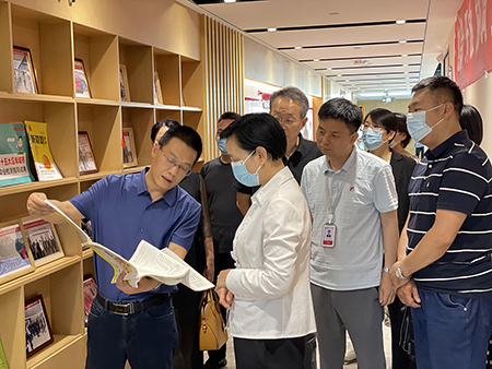 黨支部書記、董事長張振民向來訪領導介紹企業(yè)現(xiàn)狀及運營模式,并帶領陳主席一行了解了朝霞文化的圖書產品。
